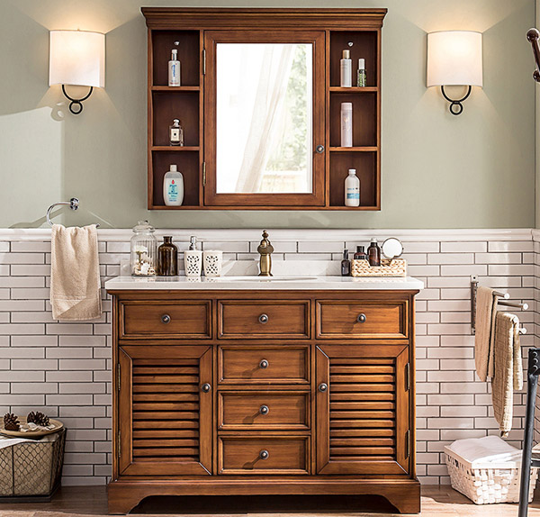 實木類浴室柜是以蒸餾脫水后的實木為基材,經(jīng)過N道防水處理工藝加工而成的柜體??钍阶匀弧⒐艠?、雍容華貴,能充分體現(xiàn)這人的家具檔次和身份的尊貴,但是對所處環(huán)境的要求很高,防水性能較低,且容易干燥。這種材質(zhì)的浴室柜得選工藝好,且品質(zhì)感好的大品牌。